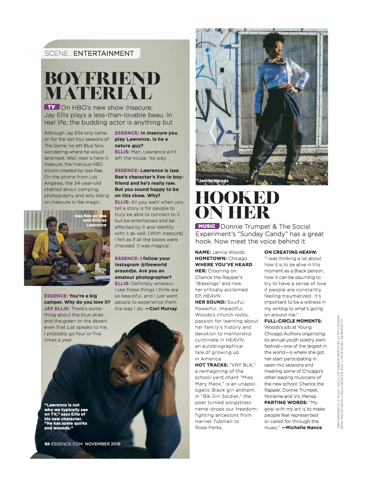 On page 48 of the 2016 November issue of ESSENCE Magazine lies a horizontally split section of entertainment coverage. Outside of the fold, a piece on tv's budding black it-guy, Jay Ellis. Inside the fold, a horizontal strip of interview with musical black girl genius, Jamila Woods. Interview and write up by yours truly. Yes, me.